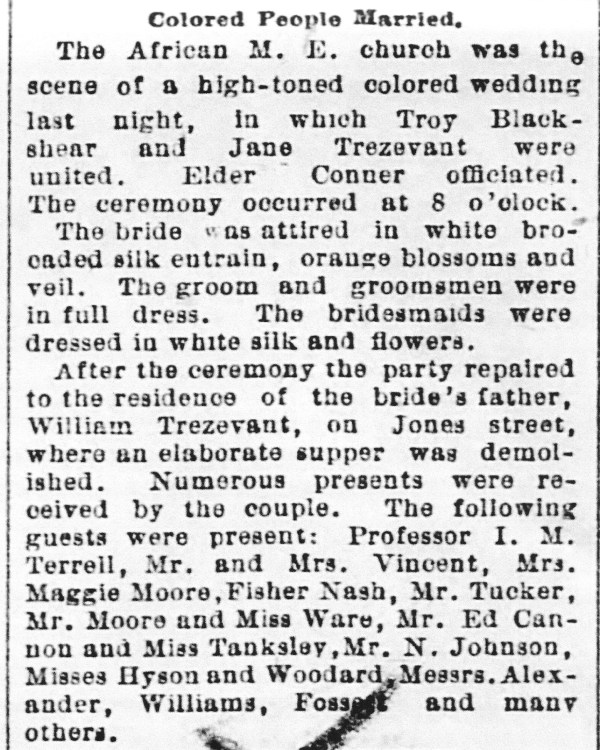 The Fort Worth Daily Gazette featured a short article on the marriage of William Troy Blackshear and Jane (aka Janey)